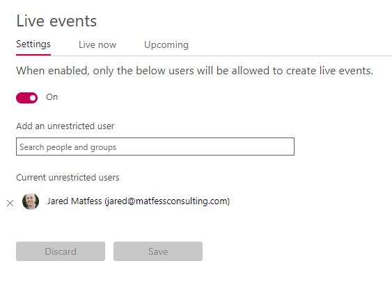Live Events – Live events is a new capability that enables live video streaming through either Teams, Yammer, or Microsoft Stream. By default Live Events are turned off and when you enable it you will need to specify users that are able to setup these type of events. From a governance perspective it’s important to consider the impact of live streaming and who might be appropriate users to have this capability. You would most likely grant this capability to individuals that are working in a Corporate Communications, Marketing, or IT users supporting those organizations or their leaders.